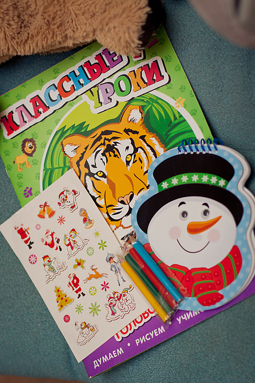 Нашли Дима - журнал+ наклейки, Даша - блокнот с карандашами)