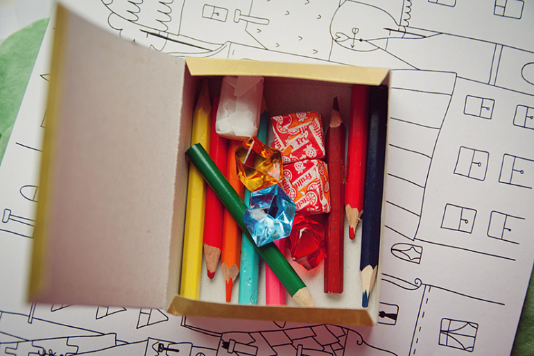 Записка в конверте: «Найди задание в зелёной корзине». Искал недолго, почти сразу пошёл куда надо) В этой книге были закладки-записочки, на тех разворотах, где нужно было выполнить задание.