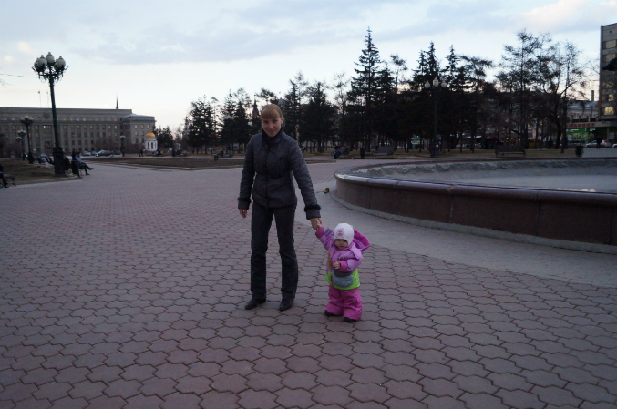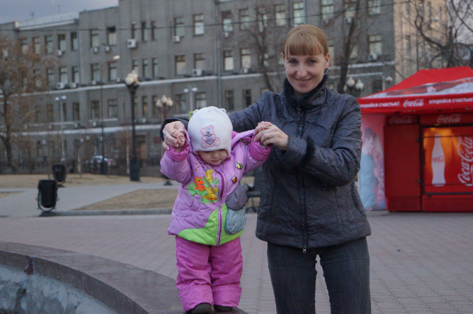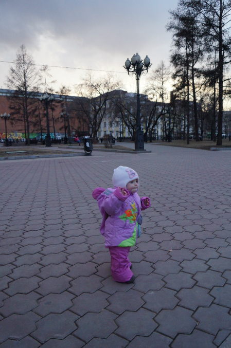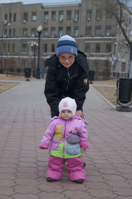 Теперь мы гуляем по улице рядом с коляской (если спать не тянет), причем если старший хоть катил коляску, когда гулял, или рядышком шел, то Кате надо обязательно в сторону - на газон, в фонтан (они еще не работают, а так интересно, что там), и обязательно в противоположную сторону, а не туда, куда я ее веду. Дома ходим везде сами, руку уже не требует, любит смотреть с балкона (за стеклом), как папа уезжает на работу, что-то ему всегда кричит и машет ручкой. А в остальном все умелки с прошлого месяца. Добавилась только ходьба теперь.