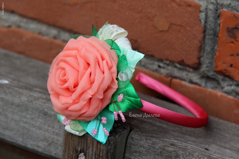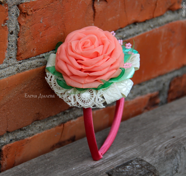 Очаровательный ободочек, кораллового цвета в сочетании с кружевом и дополнительным декором.