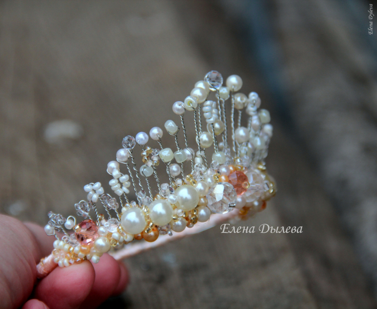 Диадема выполнена из бусин и бисера кремовых оттенков.