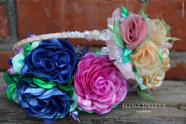 Нарядный ободочек выполнен из шифона, вуали, органзы и атласной ленты. Металлический ободочек оплетен атласной лентой, расшит бусинами и бисером.