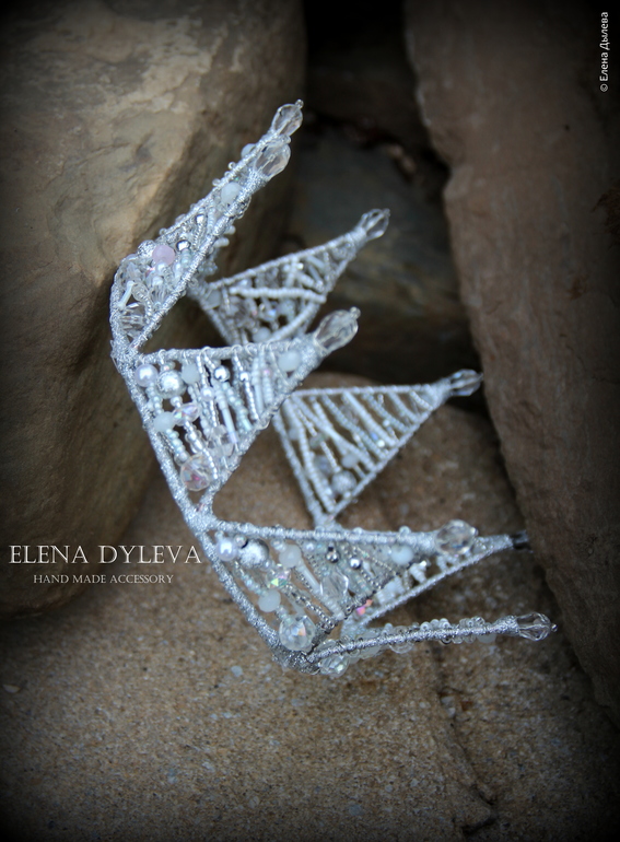 Корона имеет 8 звеньев. Выполнена из бисера и бусин белых и серебряных оттенков.(прозрачный, жемчужный, матовый...)