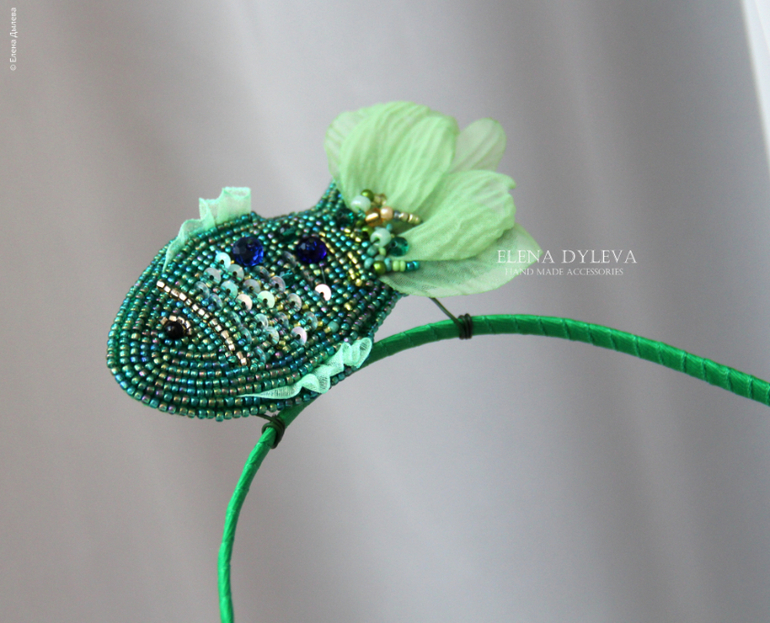 Рыбка выполнена в технике вышивки на фетровой основе. В работе использованы зеленые оттенки чешского бисера, хрустальные бусины и шифон.