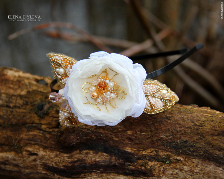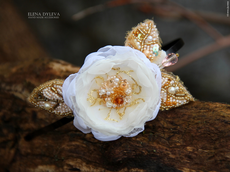 Интересный аксессуар для прически. Цветок выполнен из шифона и вуали. Листья вышиты бисером белых и золотых оттенков.