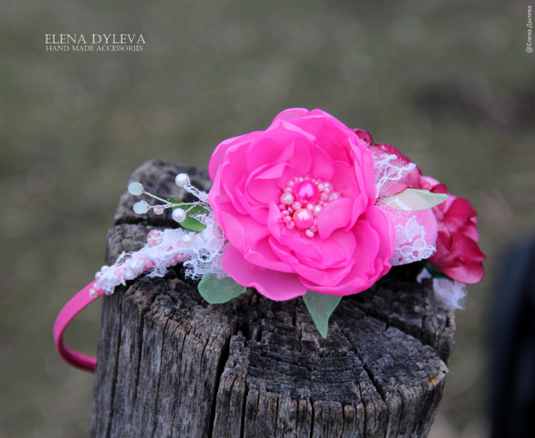 Нежнейший ободок с розовыми цветами, выполнен из ткани. Цветы расшиты бусинами и бисером. Ободок декорирован веточками из бусин.