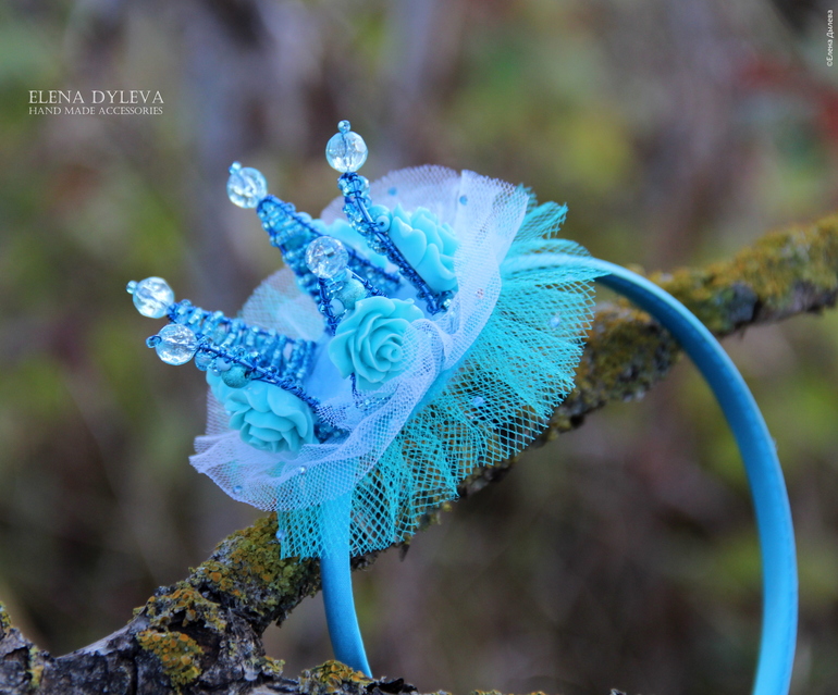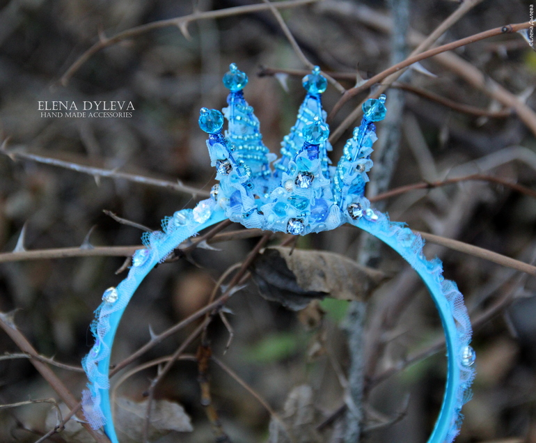Корона на ободке имеет 5 звеньев. Выполнена из бусин и бисера голубых - синих оттенков.