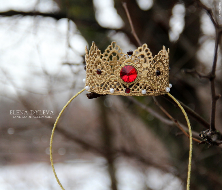 Корона выполнена из кружева, обработанного специальным раствором для жесткости. Декорирована хрустальным кристаллом красного цвета, стразами и бусинами од жемчуг.