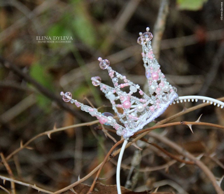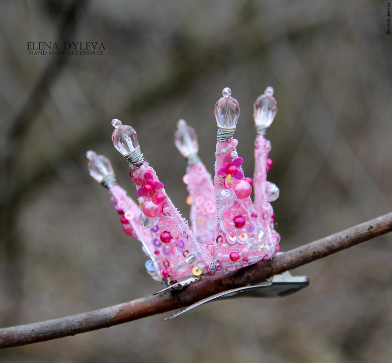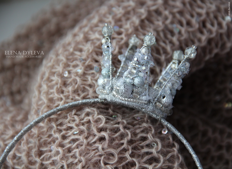Ее можно носить с помощью эластичной силиконовой резинки, заколок типа -"крокодильчиков" ; клик-клак; невидимок или ободке.(есть специальные петельки для крепления). (Прикрепление короны к ободку или повязке + 100 р)