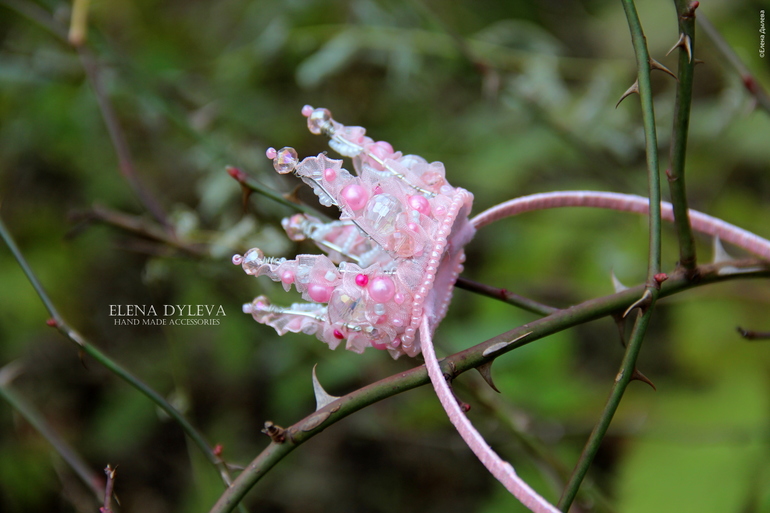 Корона прикреплена к заколке. Имеет 5 звеньев. Выполнена из бусин, бисера и пайеток - розовых оттенков.