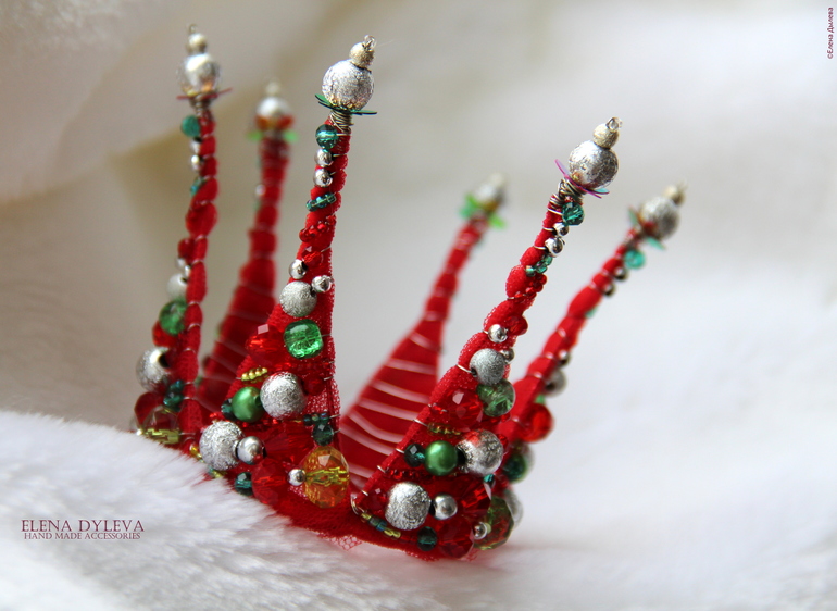 Корона имеет 6 звеньев.В работе использованы бусины разных фактур. Красные, серебряные и зеленые цвета.