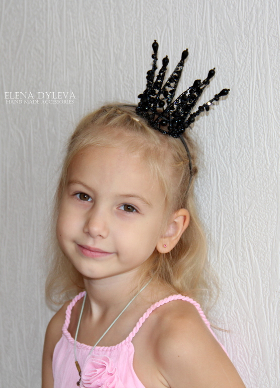 Корона имеет 6 звеньев. Выполнена из бусин и бисера черного цвета.