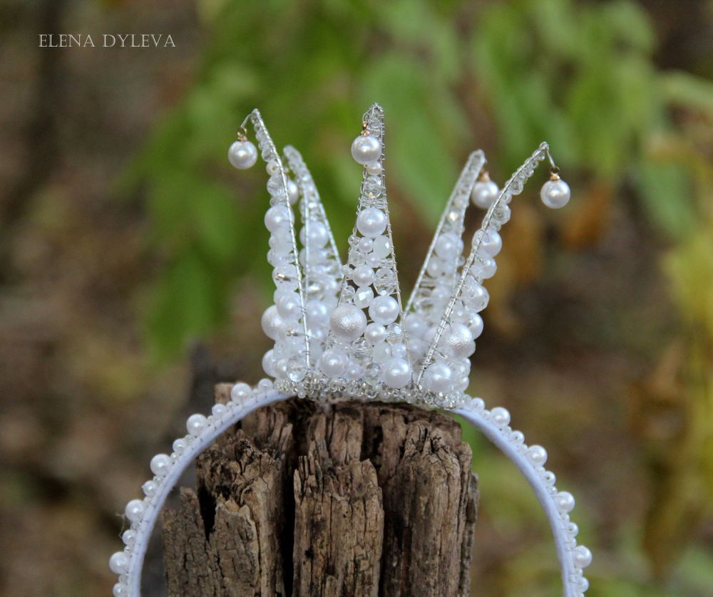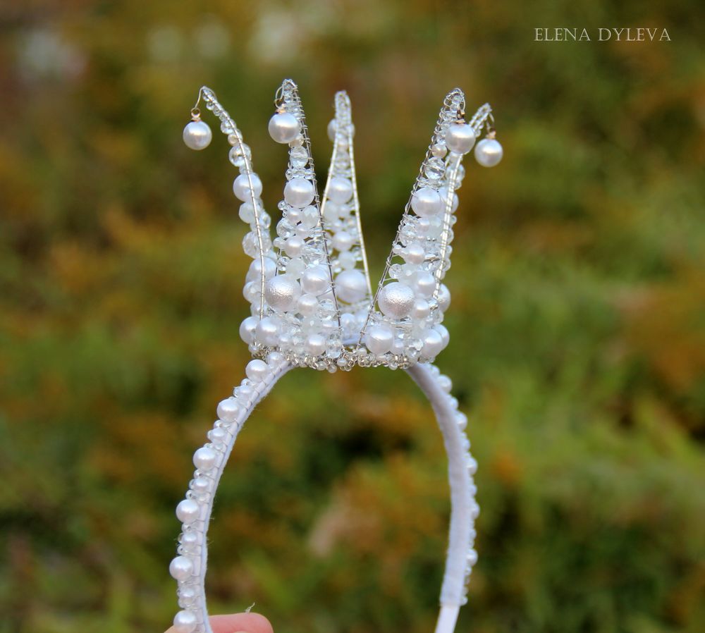 Корона имеет 5 звеньев. Выполнена из бусин под жемчуг и стеклянных бусин.
