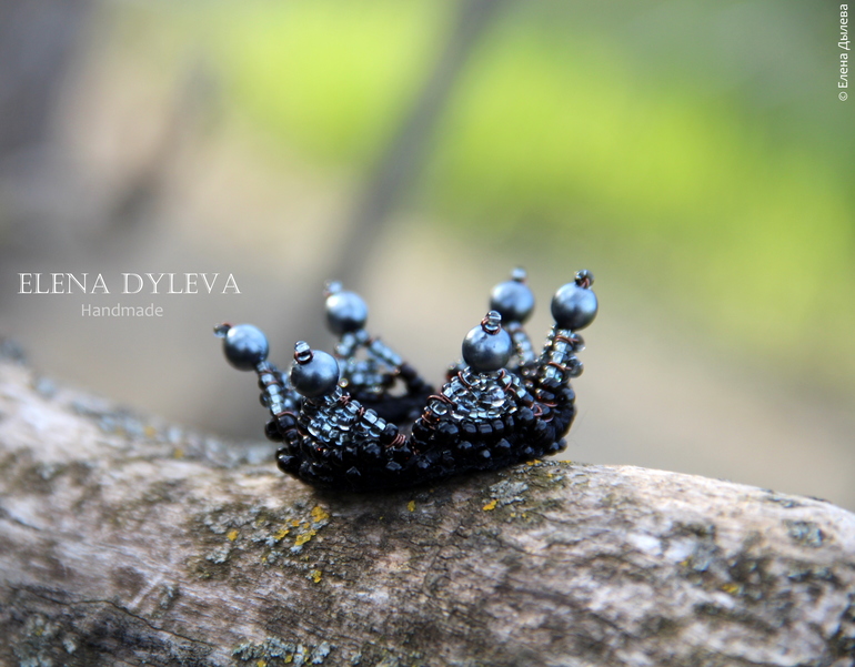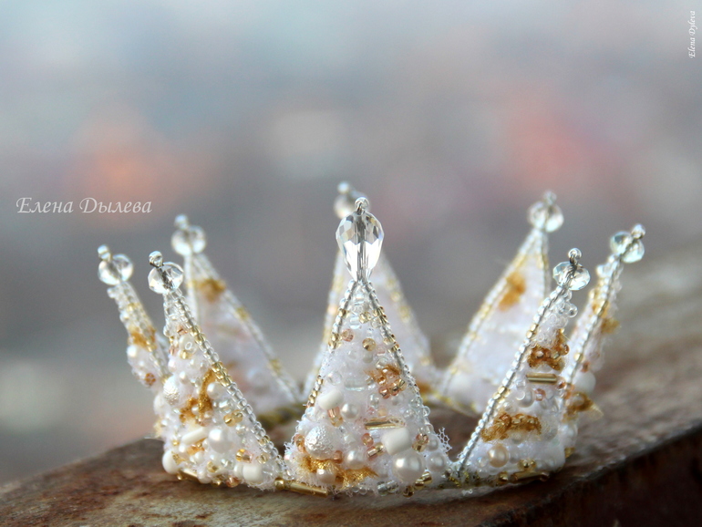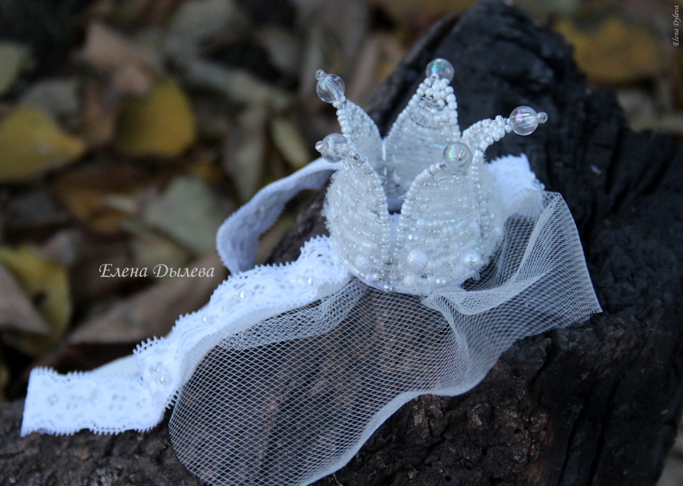 Корона выполнена из бусин и бисера 3 цветов. Корона имеет гибкую проволочную основу, что позволяет менять положение звеньев по своему желанию.
