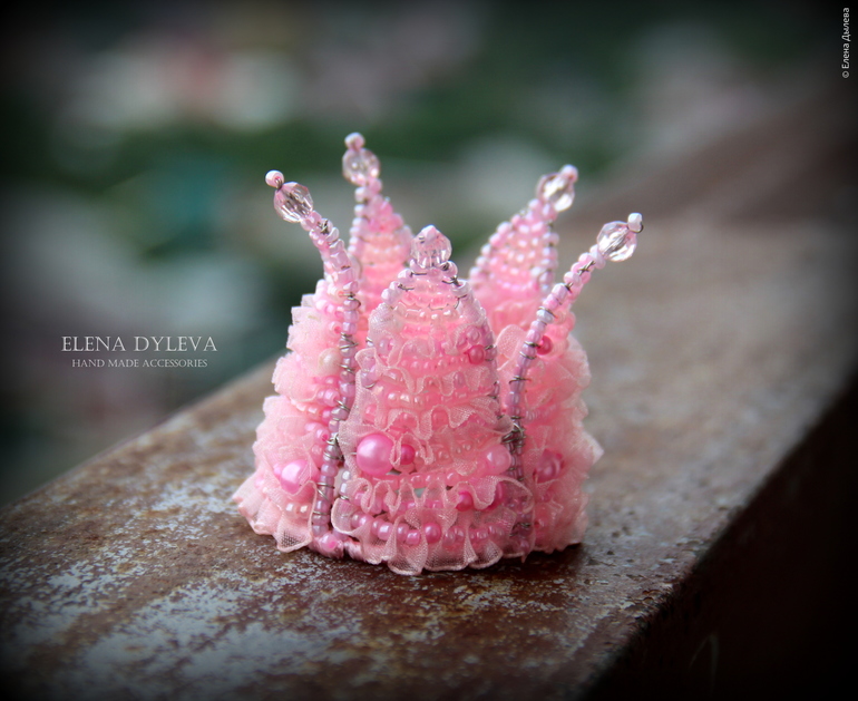 Корона выполнена из розового бисера и бусин разных оттенков.