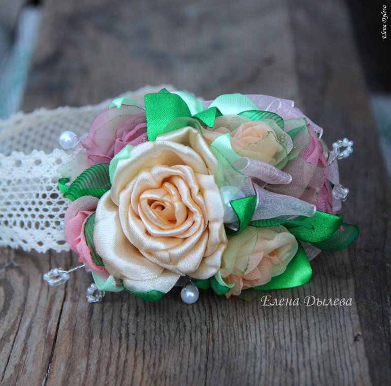 Выполнена из атласной ленты и шифона. Декорирована бусинами и бисером.