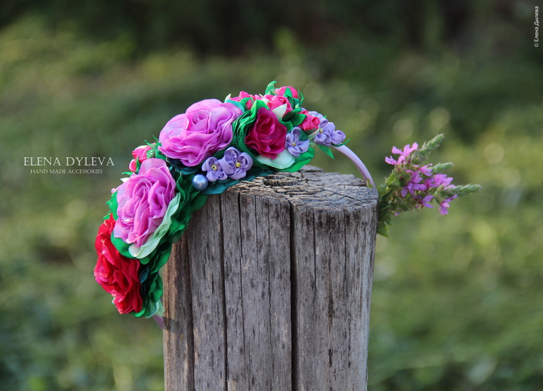 Выполнена из атласной ленты и шифона. Декорирована бусинами и бисером. Цветы тонированы красками по ткани.