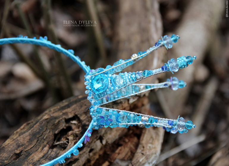 Корона на ободке имеет 5 звеньев. Выполнена из бусин и бисера голубых - синих оттенков. Дополнена пайетками и кристаллом. Ободок расшит бисером, бусинами и пайетками.