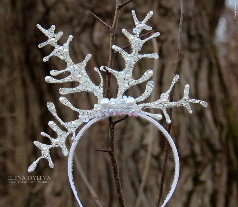 Необычный аксессуар для костюма снежинки. Выполнен с нуля из проволоки, пайеток, бисера, бусин различных фактур.