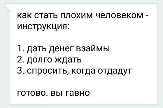 Elena 8 лет Так и есть😂 Посмотрите еще 20 записей на эту тему Отменить Ответить Виктория или 1. не дать вы гавно)) 20.01.2018 Ответить Elena 👍😂😂😂😂 21.01.2018 Ответить Дарья (планировки, дизайн интерьера) это как говорится: "берешь в долг чужие деньги, а отдавать приходится свои! " 20.01.2018 Ответить Elena Именно😂 20.01.2018 Ответить Прививка от кори. Моему сердечку сегодня годик🍼🎁🎉🎊🎈 Чаты Беременных Выберите чат: Февралята-2026 Мартята-2026 Апрелята-2026 Майчата-2026 Июнята-2026 Июлята-2026 Августята-2026