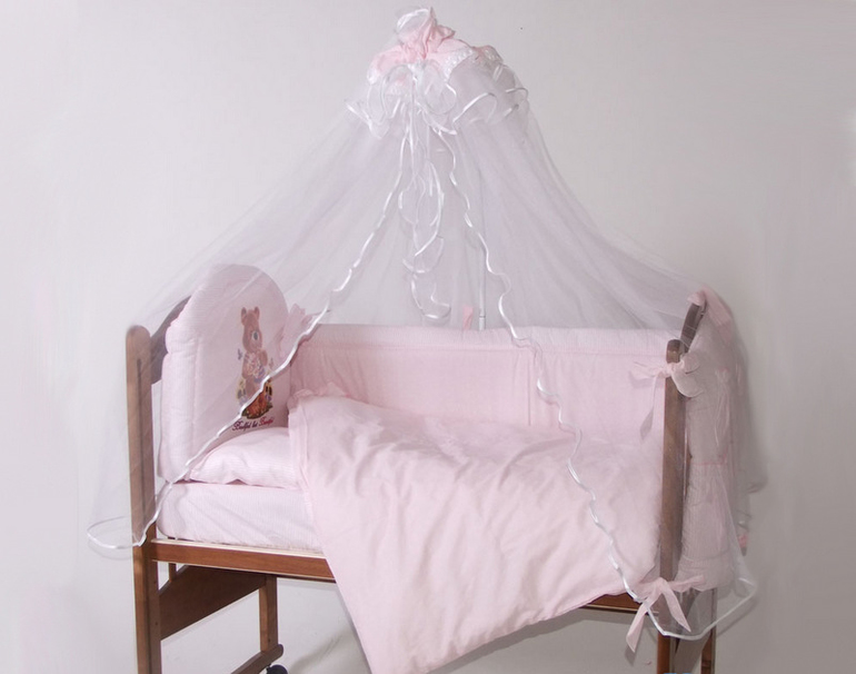 Борт сплошной. Балдахин очень пышный, все края атласной лентой обработаны, верхние воланы в несколько слоев идут из разных тканей-фатин с атласной лентой, ткань и кружево.Состояние очень хорошее, за исключением одного дефекта - это картинка по центру, бабушка у нас решила погладить всё вместе с картинкой, прижгла рисунок по центру(((((( в остальном все в идеале. Цена 500 р
