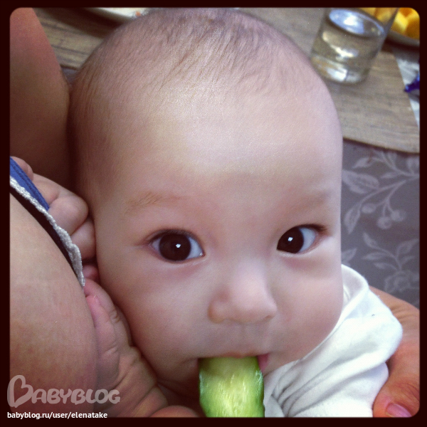 прикорм еще не начали, думаю, может в эти выходные начну, ну уж очень хочется заснять все на фото, да и не сидит еще мой сынулька, и даже не пытается садиться, зато уже почти ползет. Так устойчиво стоит на четвереньках. Я даю ему полизать, пососать, пожувать разные овощи и фрукты.