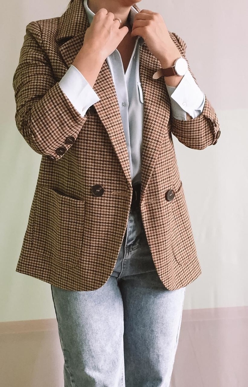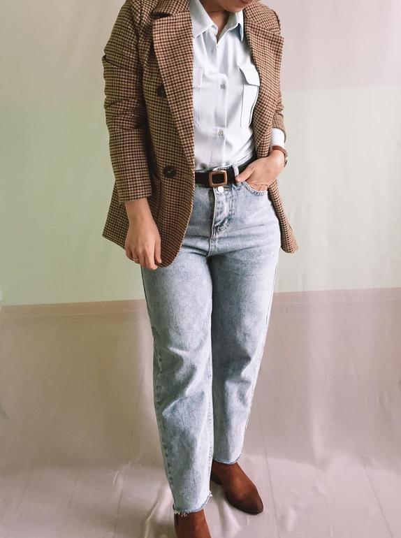 Пиджак можно под пояс. можно без пояса. У меня немного полноватые бедра, поэтому я ношу не застегивая. Создавая вертикаль и немного прикрывая бедра.