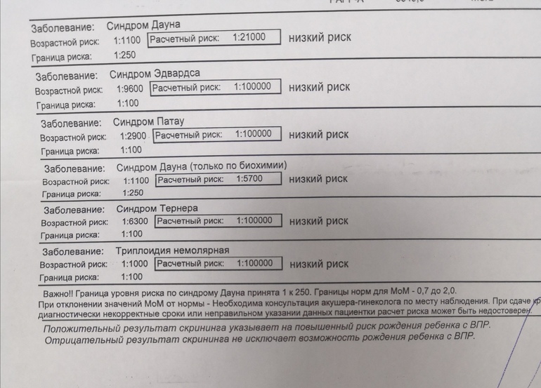 Но на вашем месте я бы меньше нервничала и реально смотрела на вещи: риск ниже 1:250 даже не рассматривается. У Вас в скрининге даже специально об этом написано.