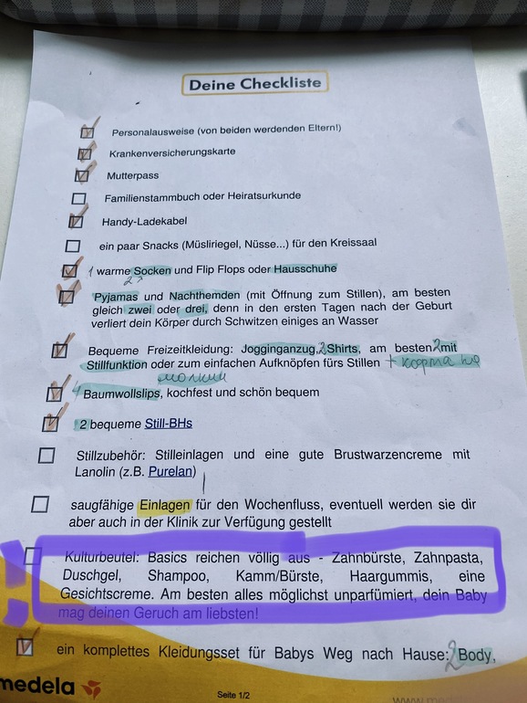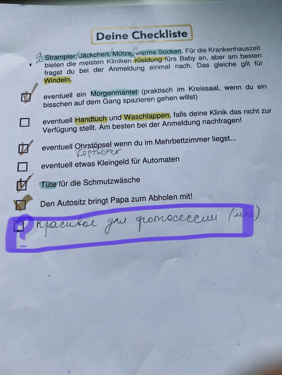 Собирала по списку, скачанному в немецко-язычном инете. Очень здравый список. Ничего в общем-то лишнего. Единственное, чего там недостает, 👇на мой взгляд, - это пункта с "красивой одеждой для мамы"👗💄, так как обычно в немецкие РД приходит фотограф и фотографирует. Я в прошлые роды здесь сильно облажалась и пришлось фоткаться в ночнушке... И полностью с обескровленным бледным, ненакрашенным лицом узника Освенцима))) Фото конечно памятные прежде всего из-за сыночка, но и себя хотелось бы там видеть более в приличном экстерьере:)