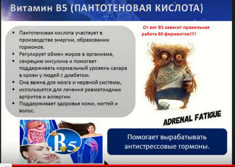 Этот витамин участвует в работе надпочечников, он вырабатывает гормон, с помощью которого проще переносится воспаление.