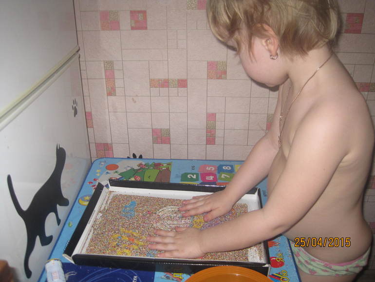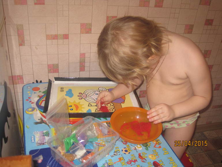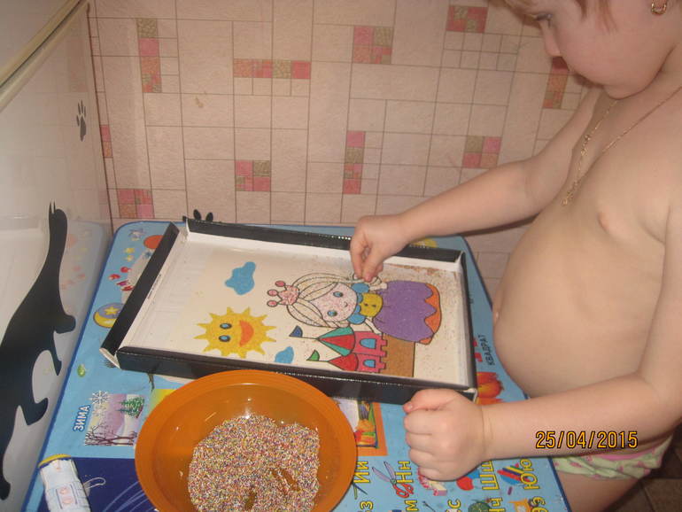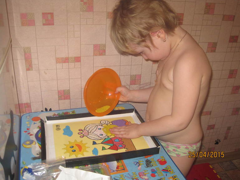 чуток приспособились, что б песок не рассыпался по всей кухни, перешли на детский столик, и дело по-шло веселее....