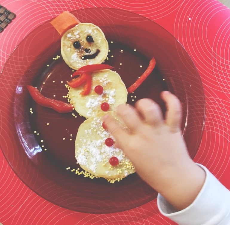 6. Приготовить на завтрак снеговика из оладушек и украсить фруктами http://blog.aistbox.ru/2014/11/bananovie-snegoviki.html?m=1