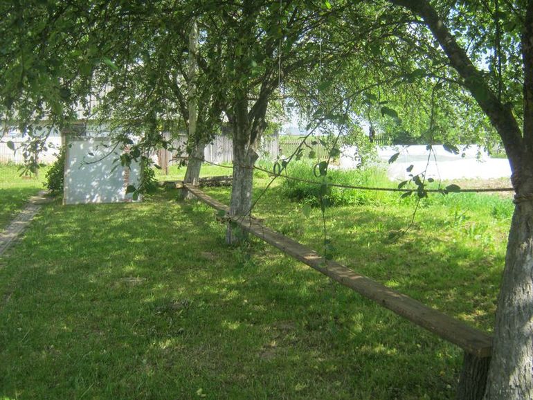 Папа Полины что-то разошелся и сделал детям «канатную» дорогу, шалаш и повесил качели. Теперь Антону и Полине играть во дворе стало еще веселее.