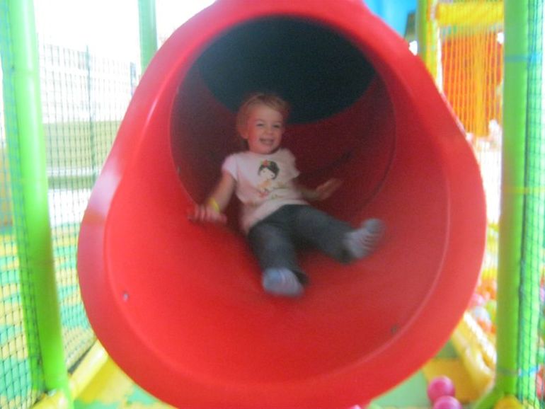 Я не ожидала, что Поле так уже понравится. Она пробыла 1 час 20, лазила по всем лестницам и этажам, каталась со всех горок. Особенно ей полюбилась труба. Как это она не убоялась туда залезть? Но веселья было масса, она каталась на ней раз 15 не меньше)