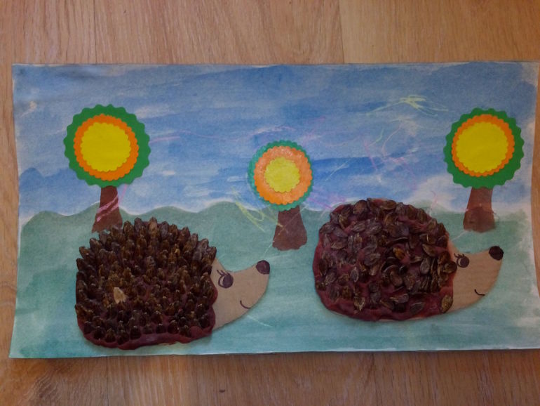 Хочу похвастаться достижением моего сынули - аппликация "Ёжики" из арбузных семечек =)