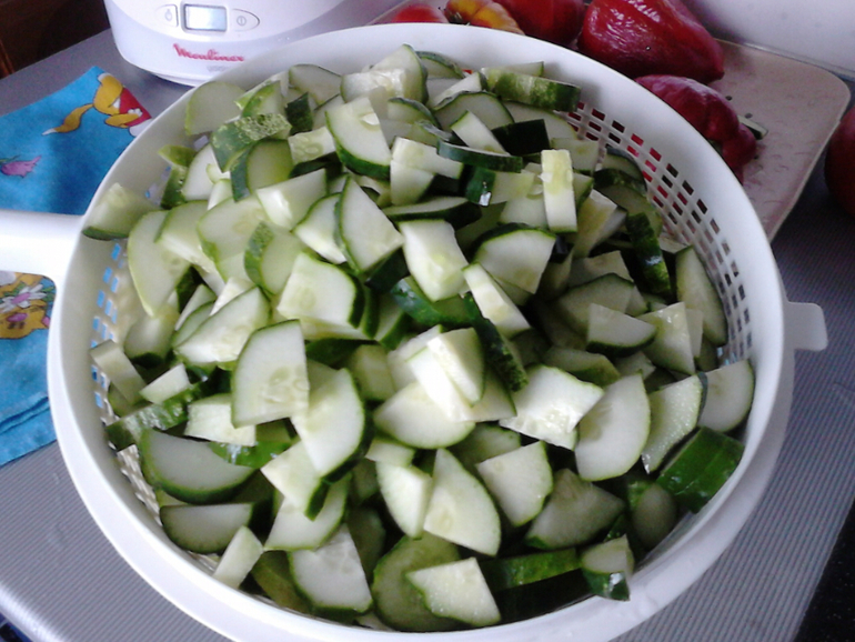 5 кг огурцов - нарезать кружочками, если крупные - сегментами