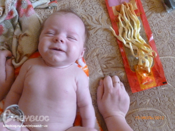 вот такие мы большие))+600 гр +5 см))итого 4500 57)маловато конечно набрали так как жара страшная стоит много кушать не хотит)))))из умелок)голову держит хорошо)играет на коврике)но не совсем уверенно)рассматриваем картинки черно-белые)улыбаемся переворачиваемся с животика на бок и со спинки на бок с животика на спинку))))плаваем в круге уже месяй)нравиться)смеемся в голос только во сне)))на яву пытаемся но сразу начинаем кашлять)))))))животик маленько еще беспокоит)))а так все замечательно))))))растем