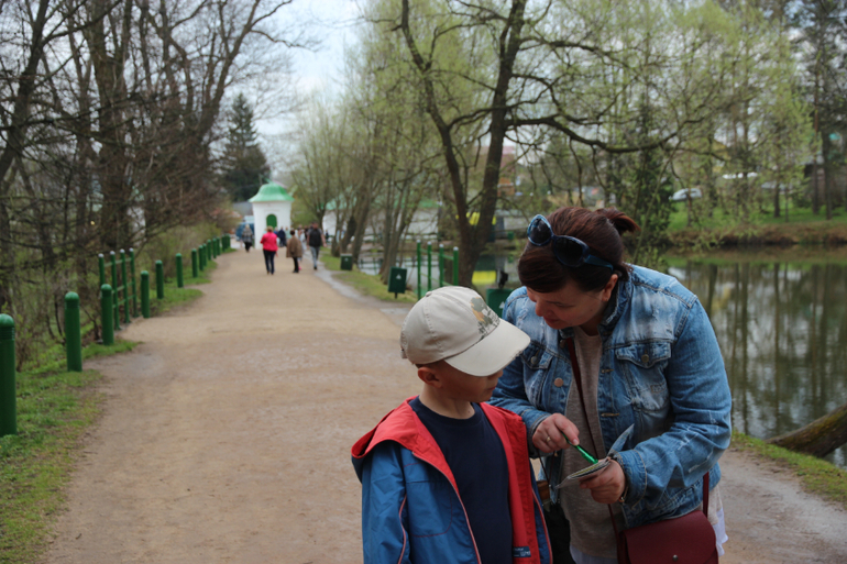 - в кассе купили детский путеводитель, с информацией и заданиями про усадьбу, счастливо его гадали. (Муж подловил отличное фото. 😂)