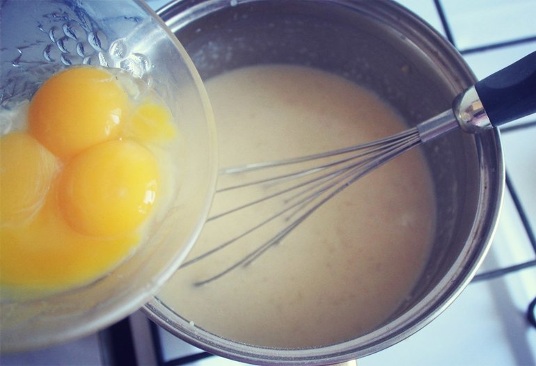 4. Влить молоко и сливки, непрерывно помешивая. Мешать до тех пор, пока крем не начнет кипеть, после чего снять с огня и немного остудить (пяти минут вполне достаточно). Вбить яичные желтки по одному, быстро размешивая, чтобы они не успели свернуться.