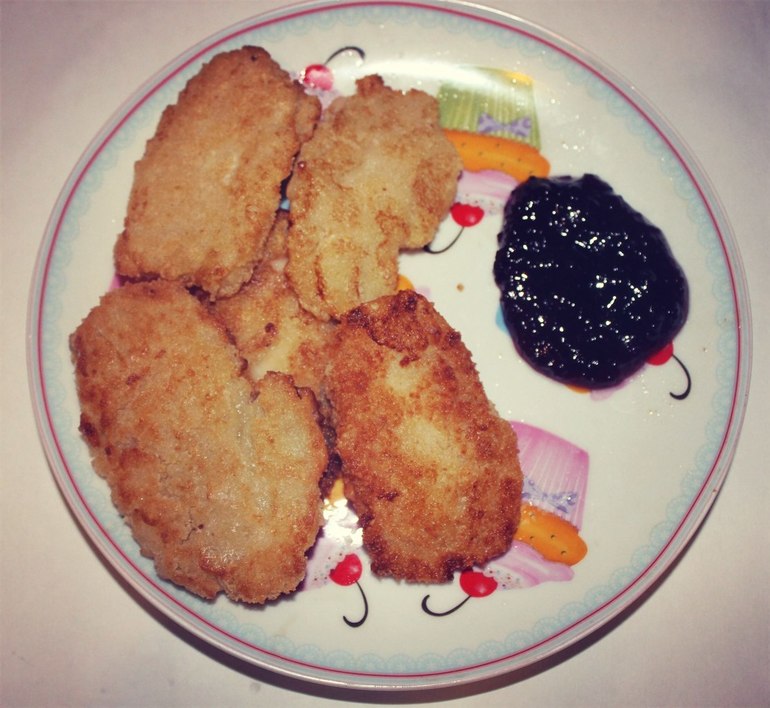 7. Теперь, внимание: ответственный момент! Очень важно действовать оперативно, чтобы крем не успел разморозиться. Каждый кусочек тщательно обвалять в муке, затем окунуть в белки. И запанировать сухарями.
