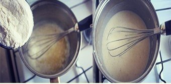 2. Когда масло растопится, убавить огонь и всыпать в сотейник примерно две трети муки, просеянной через сито, непрерывно помешивая венчиком. Продолжать работать венчиком еще минуты две, не снимая кастрюлю с огня.
