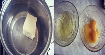 1. Сливочное масло бросить в сотейник и поставить его на огонь. Пока оно растапливается, отделить желтки от белков.