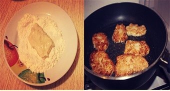 8. Обжарить кусочки в большом количестве масла. Масло должно быть очень горячее, а само обжаривание - очень быстрым. Это нужно для того, чтобы крем, «запечатанный» внутри, не успел схватиться. В идеале должна получиться хрустящая корочка и жидкая молочная начинка.