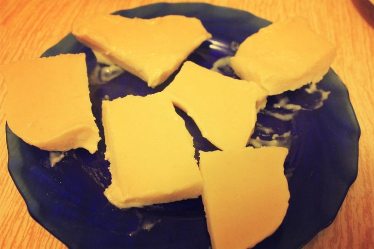 Как следует перемешать вилкой яичные белки (не взбивать). Далее разрезать застывший крем на квадратики, ромбы или треугольники.