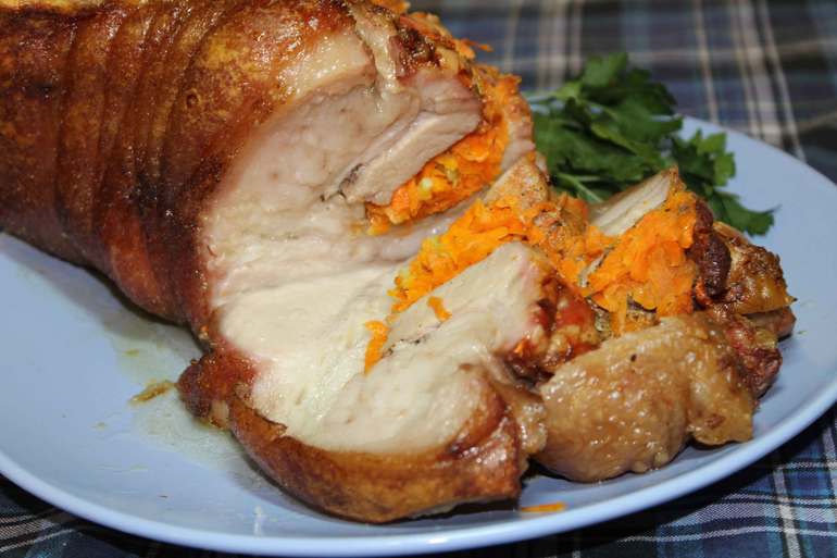 Выкладываем смесь моркови и чеснока на внутреннюю сторону брюшины, сворачиваем все рулетом и обвязываем капроновой нитью.