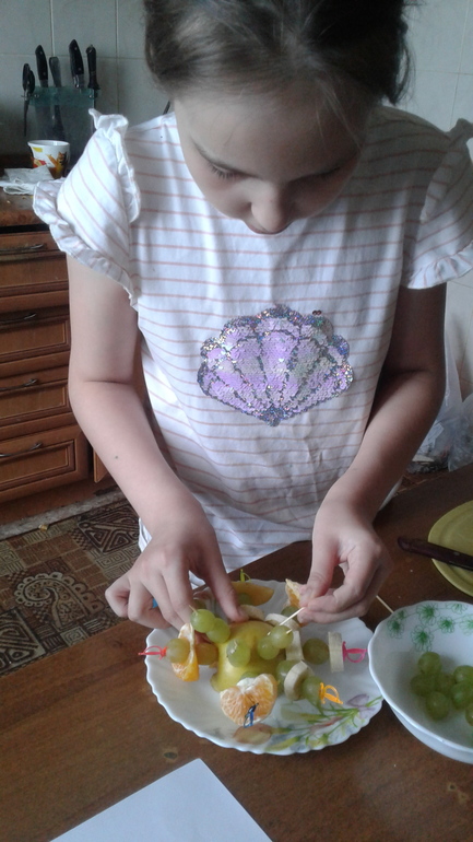 Доча полистала учебник по технологии. И захотела сделать вот таких ежиков из фруктов. Делали дети все вместе. И родителей не забыли ))