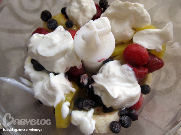 чтобы смузи было нужной консистенции (по идее, его надо пить) в него добавляют что-нибудь, чтобы разбавить - это могут быть сок, сливки, молоко, йогурт. Я обычно добавляю йогурт, но в холодильнике нашла только варькин творожок - и он пошёл в дело )