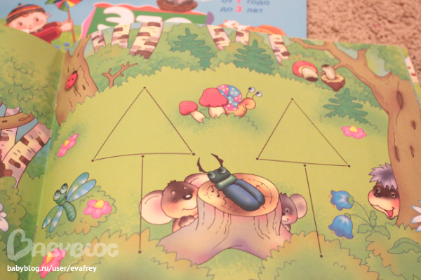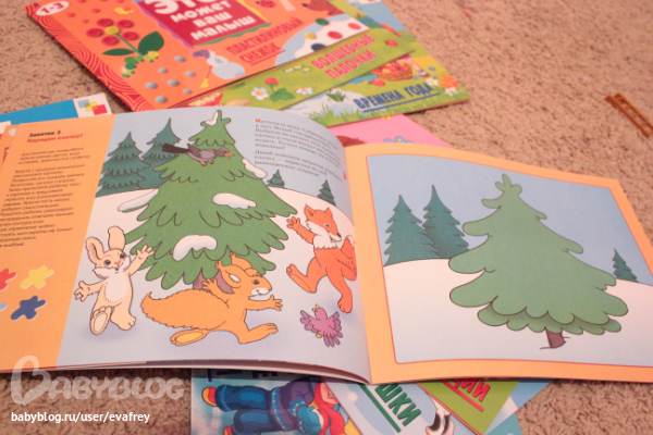 Есть задания где нужно сминать маленькие бумажки, делая из них например корм для птичек или ракушки на берегу и много много много других увлекательных занятий такие как пластилиновые апликации или рисование пальчиками и ладошками. Так же к каждой страничке прилагается интересная история чтобы развивать фантазию и подогревать интерес малыша. На чегодняшний день для нашего возраста это наверное лучшее что мне попадалось!