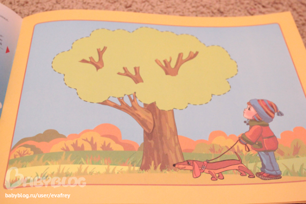 а в этой книжке есть в середине спец бумажечки которые нужно разрывать и приклеивать как листочки на дерево.