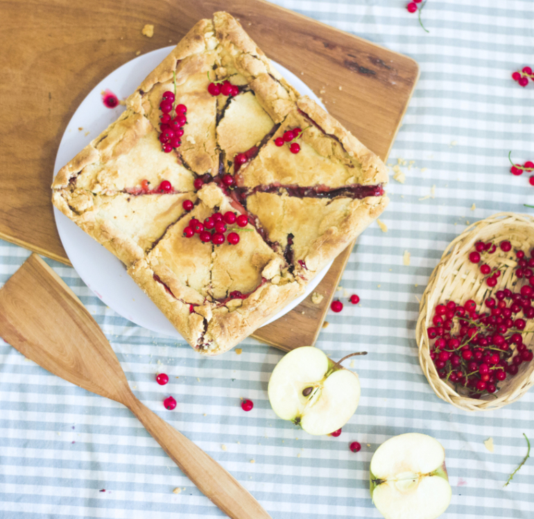 Приготовить начинку. Яблоки вымыть, очистить и нарезать брусочками. Ягоды перебрать, вымыть и обсушить. Смешать яблоки и смородину с крахмалом, корицей и 6 ст. л. сахара.